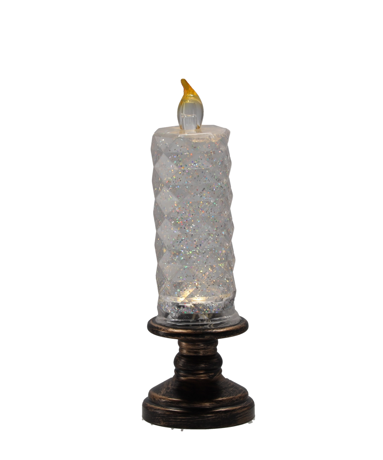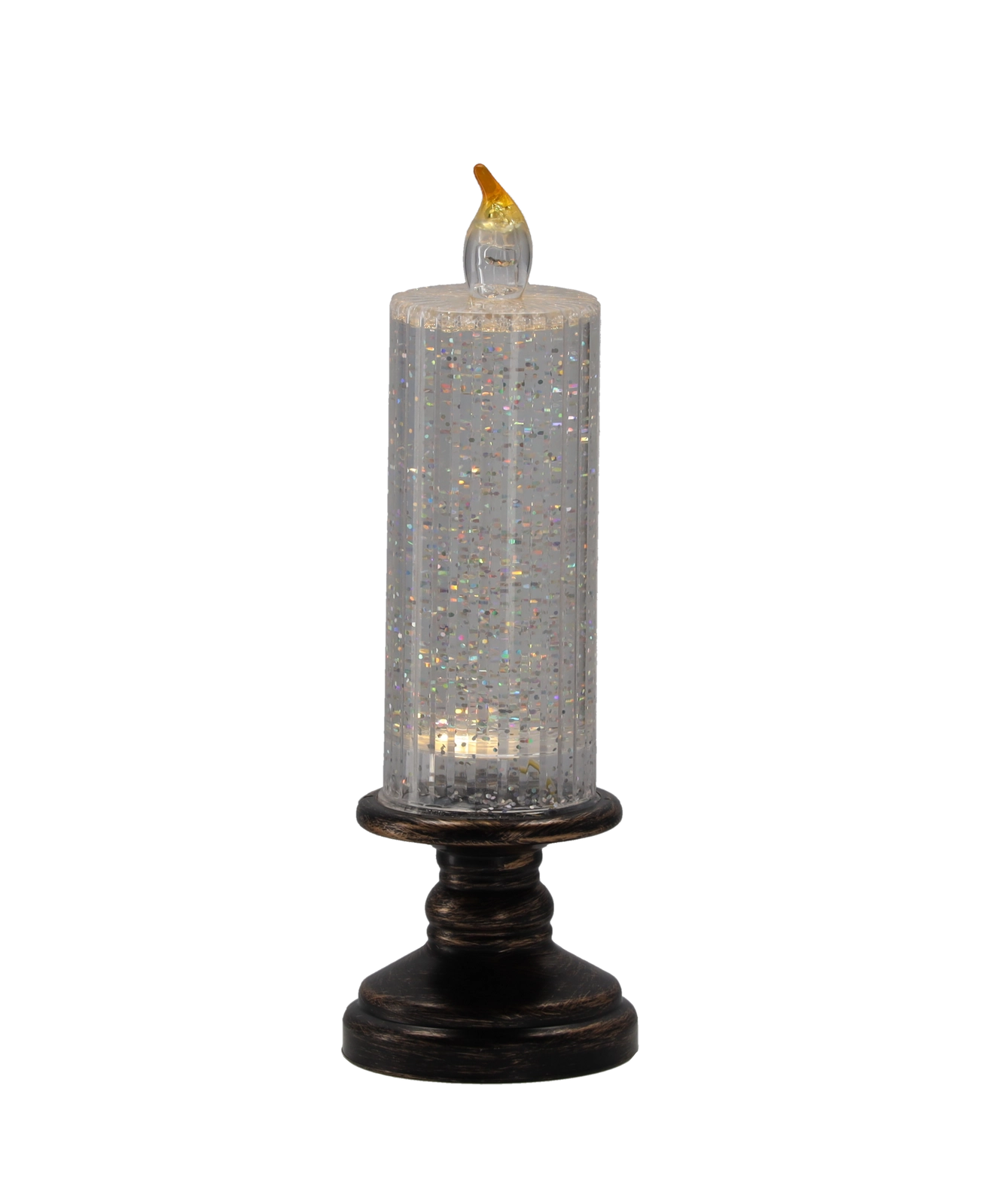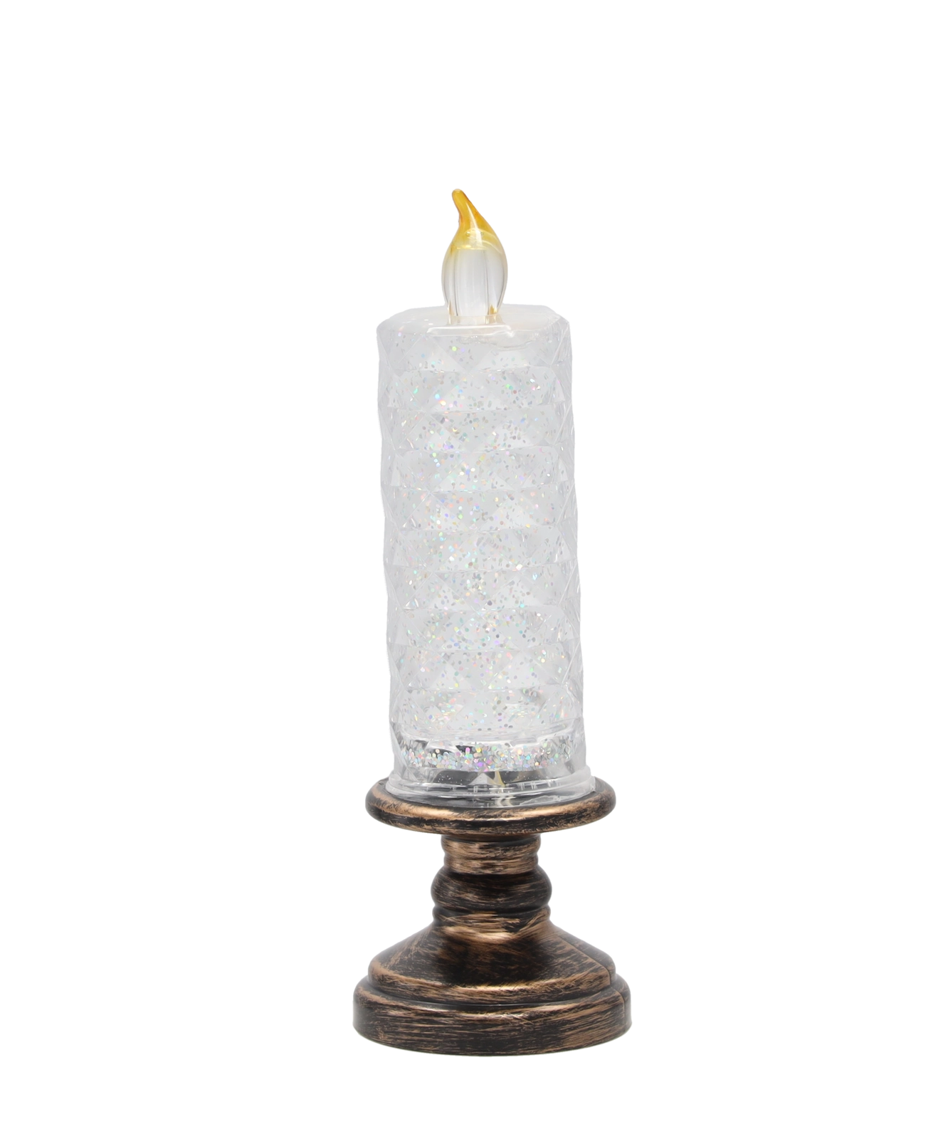 Stijlvolle decoratieve LED-kaars met een transparante cilinder vol glitters en een vintage voet creëert in een oogwenk een knusse sfeer. Zodra je het licht aandoet, ontstaat er een zacht warm licht en een stralend sprankelend effect, ideaal voor op tafel, dressoir of vensterbank. De voeding gebeurt via LR44-batterijen, zodat je haar eenvoudig overal zonder kabels kunt plaatsen.