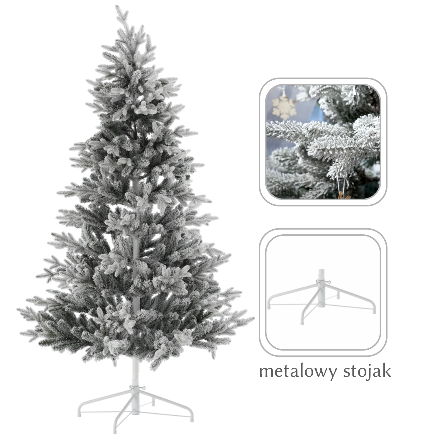 De synthetische kerstboom Agata met sneeuweffect biedt een authentieke winterse uitstraling zonder naaldrommel en zonder onderhoud. Groene takken met een dun laagje “sneeuw” creëren een feestelijke sfeer in elk interieur – van woningen tot kantoren en commerciële ruimtes.