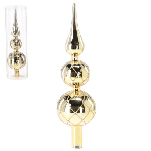 Geef je boom een luxueuze glans en feestelijke elegantie met deze glazen piek van 30 cm hoog. Dankzij de klassieke, slanke vorm, het gouden design en het sprankelende net met kristallen weerkaatst hij het licht prachtig. De standaardbevestiging zorgt voor een eenvoudige en veilige plaatsing op de top van de boom.