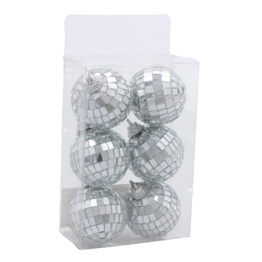 Geef je feestelijke decoratie een frisse glans met deze set van zes zilverkleurige ballen in disco-stijl. Het spiegelende effect weerkaatst het omgevingslicht en creëert een sprankelende sfeer die opvalt in de kerstboom, kransen en tafeldecoraties.