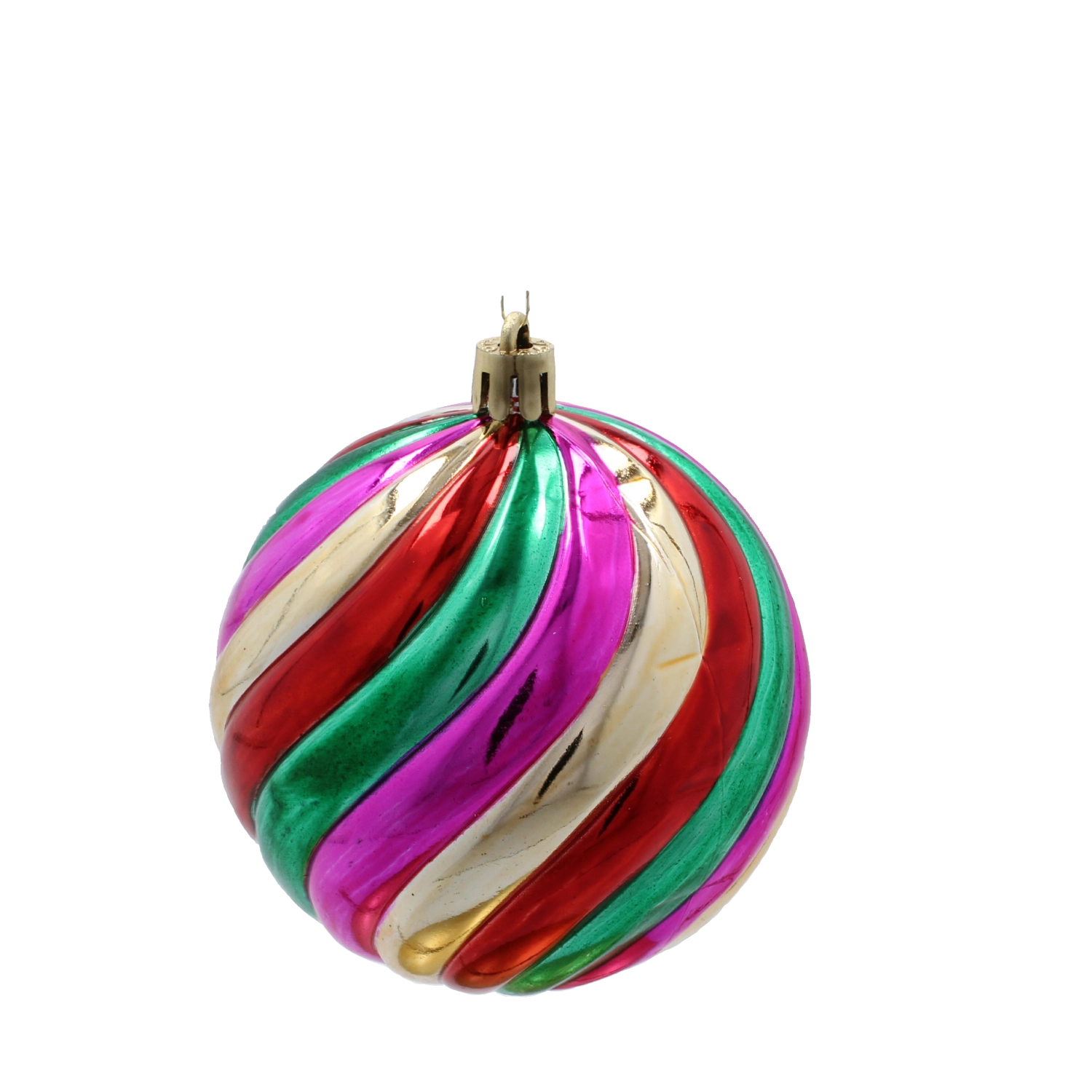 Vrolijke spiraalballen in roze, groen, rood en goud geven de boom een opvallend accent en feestelijke energie.