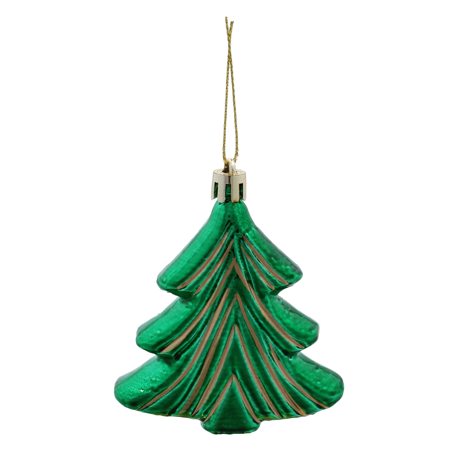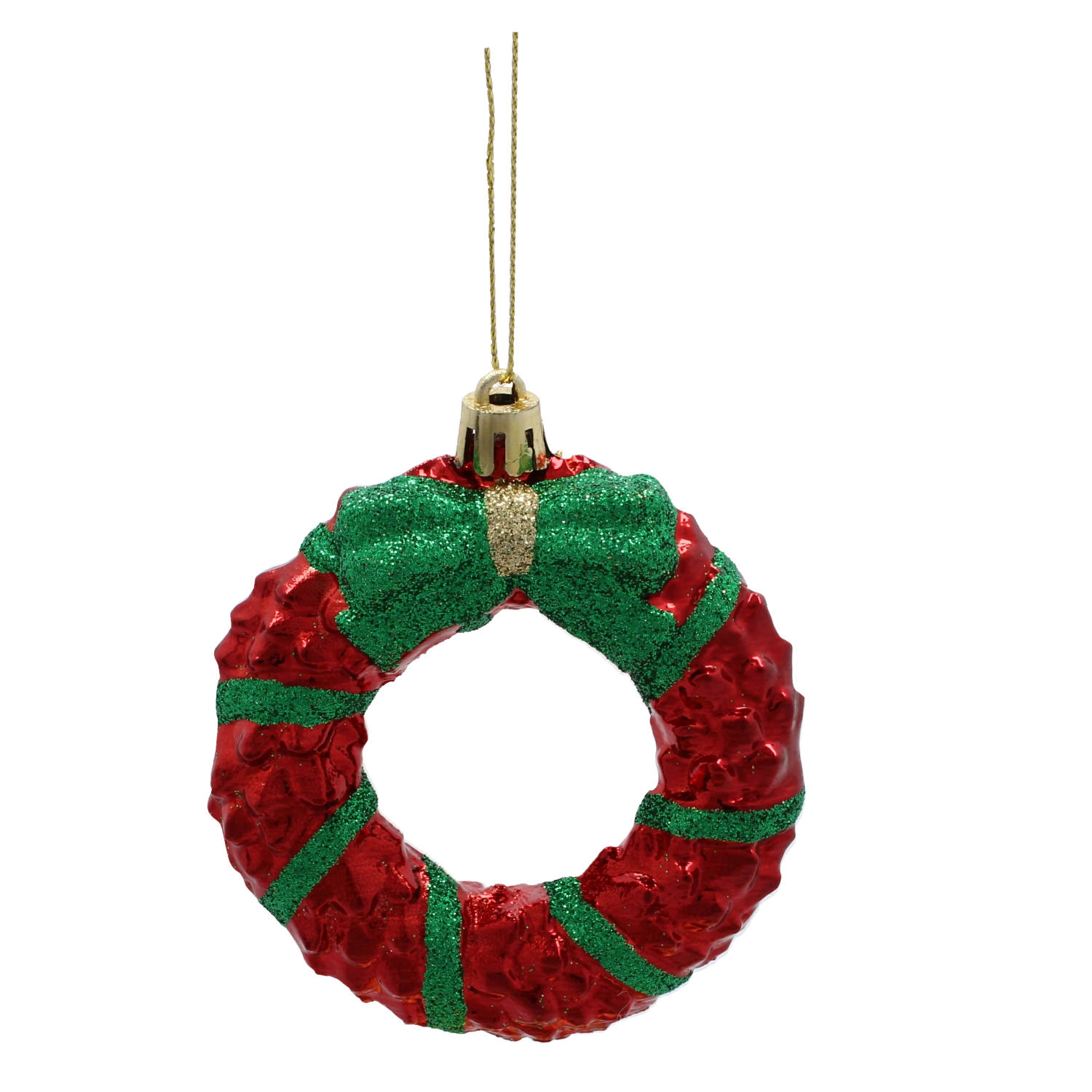 Geef je boom een feestelijke touch met een set van zes kerstornamenten in de vorm van een krans en een boompje met een diameter van 8 cm. Licht en duurzaam kunststof zorgt voor eenvoudig ophangen zonder de takken te belasten, terwijl glanzende en sprankelende details een harmonieuze en elegante uitstraling aan de hele decoratie geven.