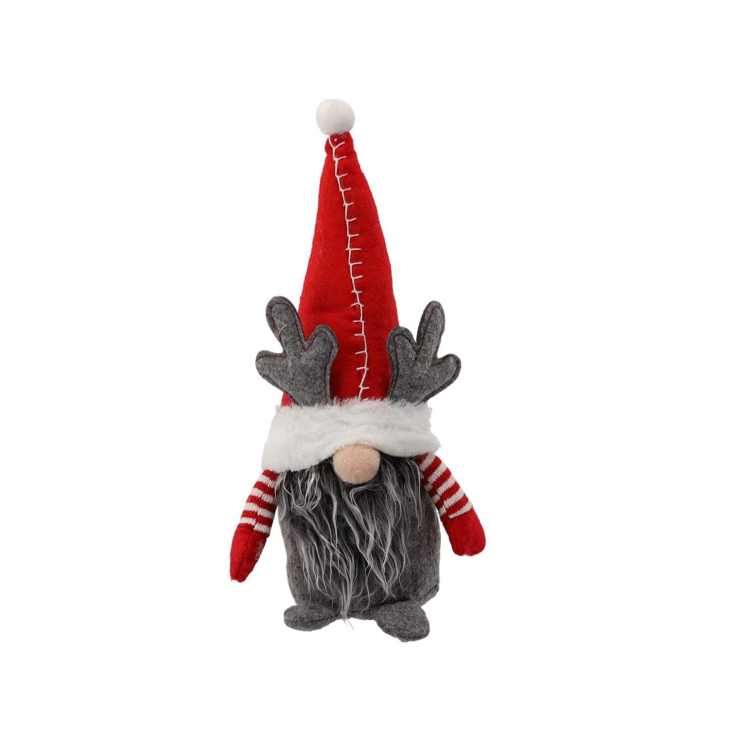 Deze decoratieve kabouter in rendierstijl valt op door de hoge muts met witte rand, grijze geweitjes en een lange, zachte baard. Dankzij de zachte textiele materialen en zorgvuldige afwerking is hij ideaal als seizoensdecoratie voor de woonkamer, hal of kantoor.
