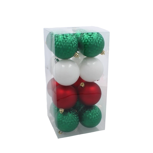 Stijlvolle set van 16 kerstballen met een diameter van 8 cm in rood, groen en wit, die je boom een traditionele en elegante uitstraling geven. De combinatie van matte en glanzende afwerkingen zorgt voor een prachtige schittering in het licht. Het duurzame kunststof materiaal is veilig voor kinderen en huisdieren en garandeert een lange levensduur. Inclusief praktische verpakking voor eenvoudig opbergen.