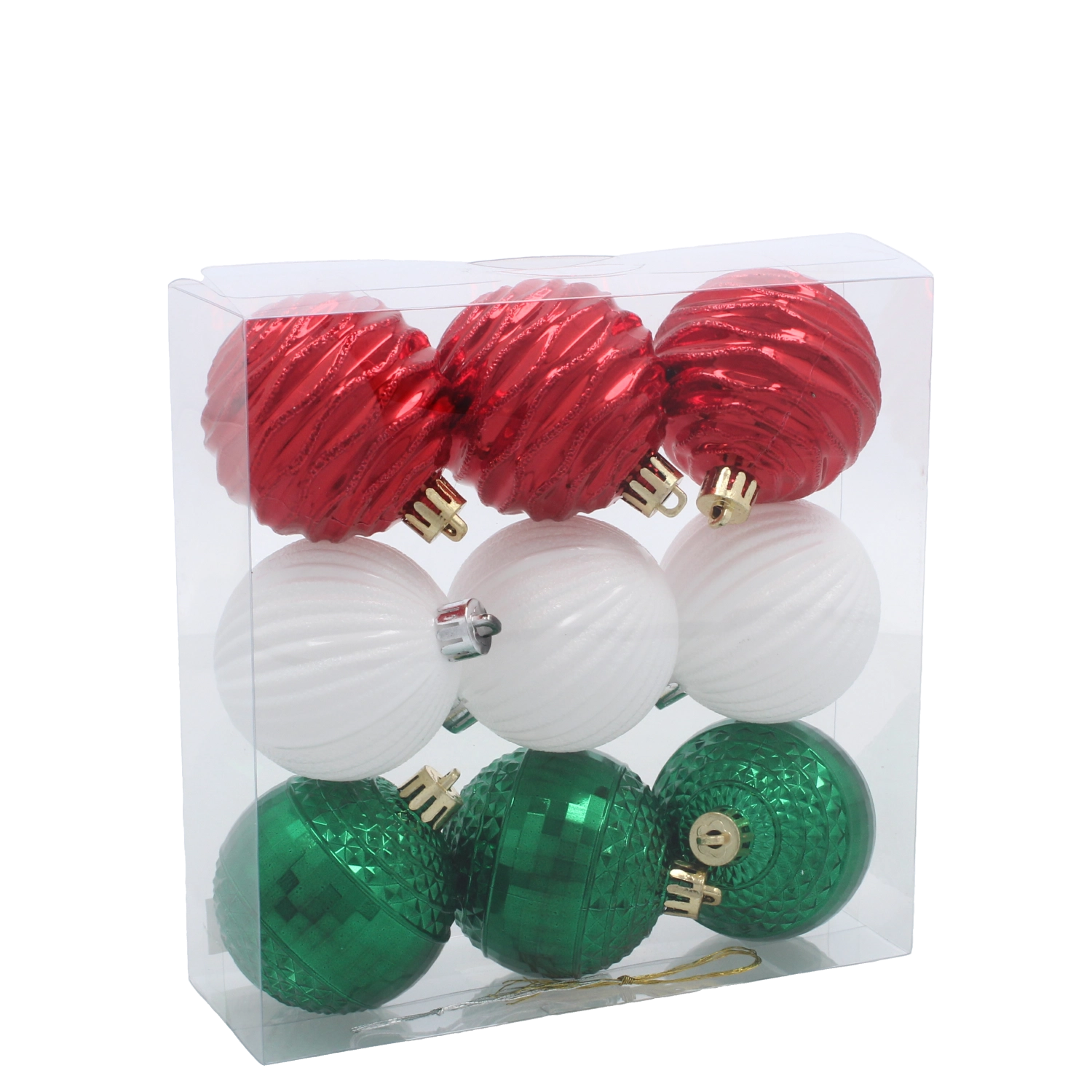 Creëer thuis een traditionele en elegante kerstsfeer met een set van 9 kunststof ornamenten met een diameter van 6 cm in rood, groen en wit. Het lichte en stevige materiaal is veilig voor kinderen en huisdieren, elke bal heeft een koordje voor eenvoudig ophangen en verschillende texturen voor een glanzend effect in de boom.