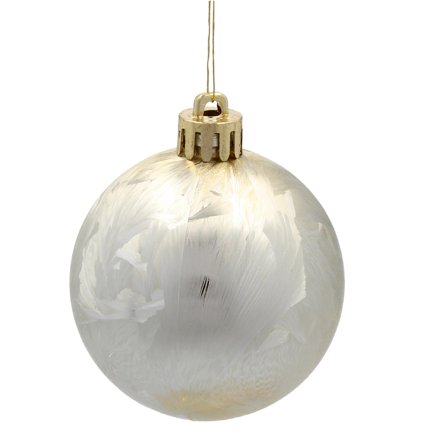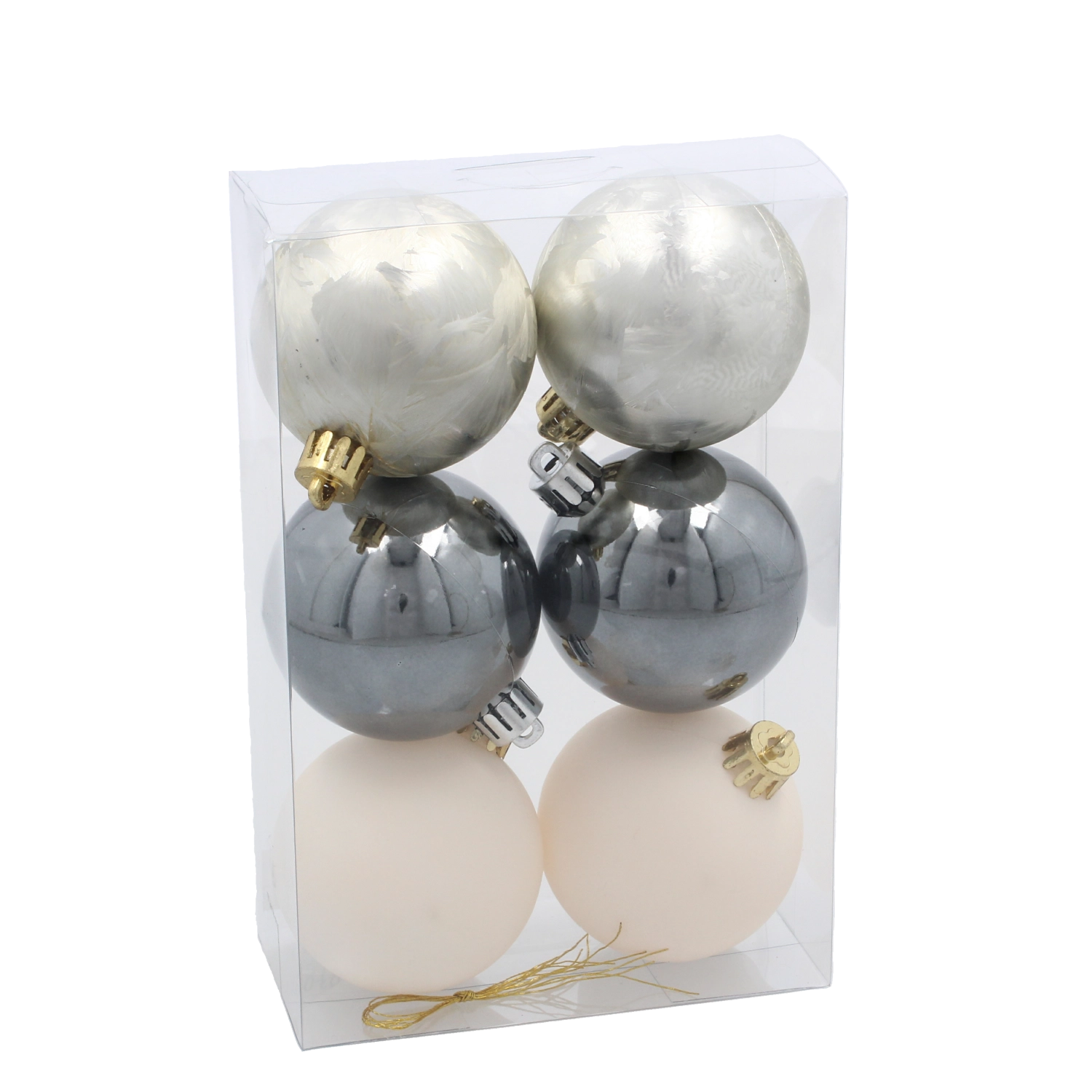 Elegante set van zes kerstornamenten met een diameter van 6 cm in de tinten champagne, grijs en wit, die je boom een subtiele glans en tijdloze stijl geven. Het duurzame, onbreekbare ontwerp is ideaal voor huishoudens met kinderen of huisdieren en de combinatie van een glanzende, matte en glitterafwerking zorgt voor een harmonieuze, makkelijk te combineren decoratie.