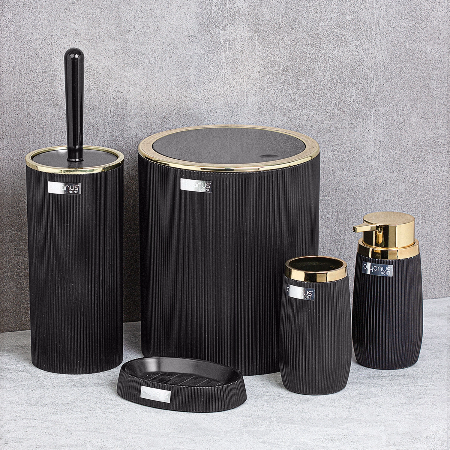 Elegante ronde badkamerset van duurzaam plastic in een combinatie van zwart en goud, die uw badkamer een luxueuze uitstraling en functionaliteit geeft. In de set vindt u 5 basisaccessoires voor de dagelijkse hygiëne: een prullenbak, wc-borstel, zeepdispenser, beker voor tandenborstels en een zeepbakje. Eenvoudig te onderhouden, licht van materiaal en stijlvolle details voor een perfect afgestemde look.