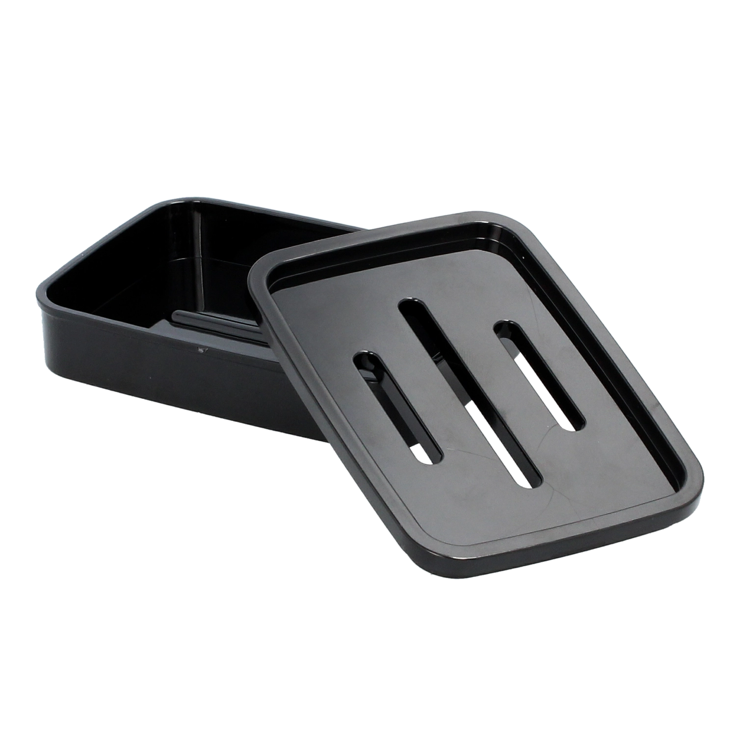 Drie langwerpige sleuven in het deksel/de inzet voeren water betrouwbaar af naar het onderste deel, zodat de zeep droog en stevig blijft.