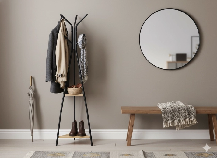 Strategisch geplaatste haken bieden plaats aan jassen, sjaals en tassen, zodat alles binnen handbereik is zonder te kreuken.