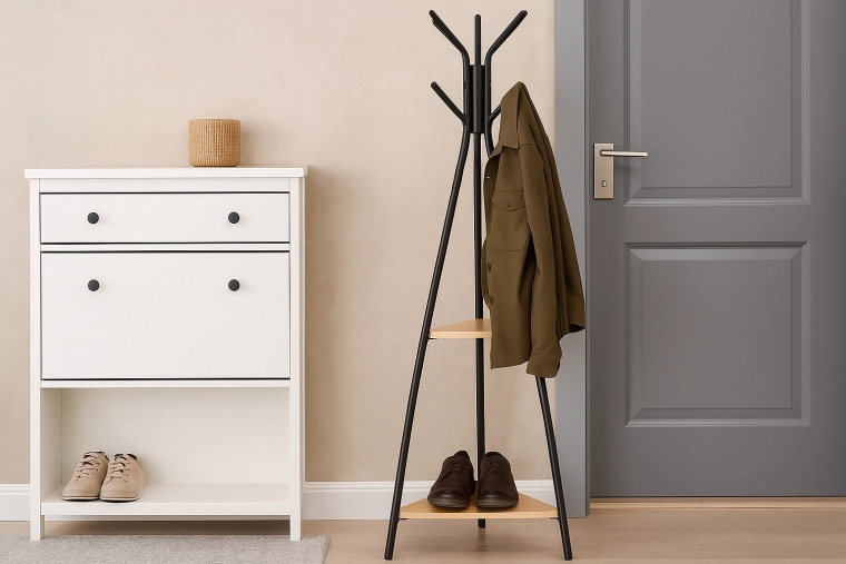 De elegante staande kapstok TARES combineert een modern design, een stabiele metalen constructie en twee praktische planken van MDF. Met een hoogte van 180 cm biedt hij voldoende haken voor jassen, sjaals en tassen, terwijl de driepotige basis ruimte bespaart en stabiliteit garandeert. Ideaal voor hal, kantoor of lobby zonder in de muur te hoeven boren.
