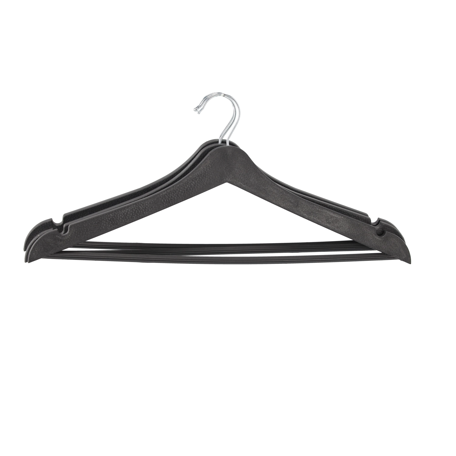 De 360° draaibare haak maakt het eenvoudig de oriëntatie van kleding aan de stang te veranderen, inkepingen op de schouders houden items met bandjes veilig vast en de onderste dwarslat is ideaal voor broeken, sjaals of riemen. De stevige constructie van ABS en PET met nylonfluweel-afwerking kan ook zwaardere jassen en truien aan.