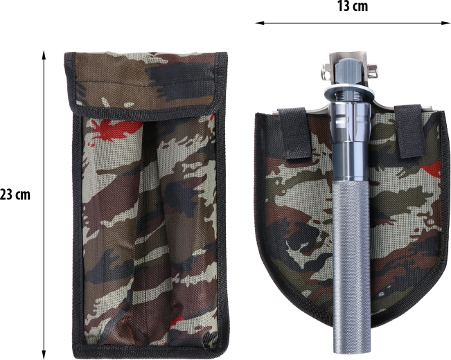 Universele outdoor-schep die kracht, duurzaamheid en laag gewicht combineert. Gemaakt van roestvrij staal en aluminium en biedt een breed scala aan functies – van spade, hak en zaag tot mes, vuursteen, schroevendraaiers en fluitje. In uitgevouwen toestand stabiel en efficiënt, na inklappen compact en gemakkelijk te dragen in de meegeleverde hoes – ideaal voor kamperen, trekking en noodsituaties.