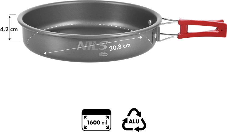 Deze veelzijdige outdoorpan combineert een compact ontwerp met hoge functionaliteit. De diameter van 20,8 cm, hoogte van 4,2 cm en inhoud van 1600 ml maken haar perfect voor het bakken van eieren, groenten of pannenkoeken, evenals voor stoven of het opwarmen van kant-en-klare maaltijden. Dankzij het lage gewicht en de inklapbare handgreep stop je haar eenvoudig in je rugzak.