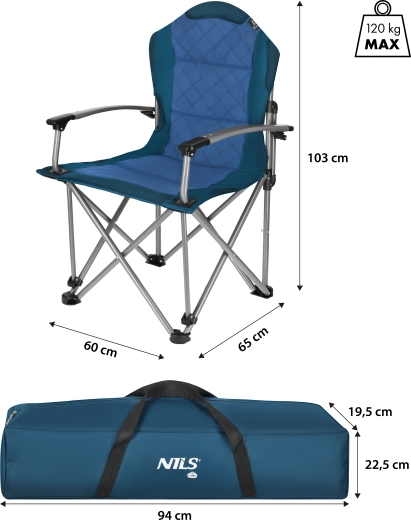 Robuuste en comfortabele opvouwbare NILS Camp-stoel voor kamperen, vissen en de tuin, met een hoge rugleuning, brede armleuningen en zachte bekleding. Het stabiele stalen frame, de duurzame bekleding van 600D Oxford, draagvermogen 120 kg en het snelle inklappen in de draagtasje maken deze stoel ideaal voor comfortabel ontspannen in de natuur.
