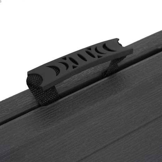 De tafel vouw je in een handomdraai op zonder gereedschap. In opgevouwen toestand heeft hij een praktisch handvat en minimale afmetingen van 91 × 74 × 7 cm voor eenvoudig dragen en opbergen.