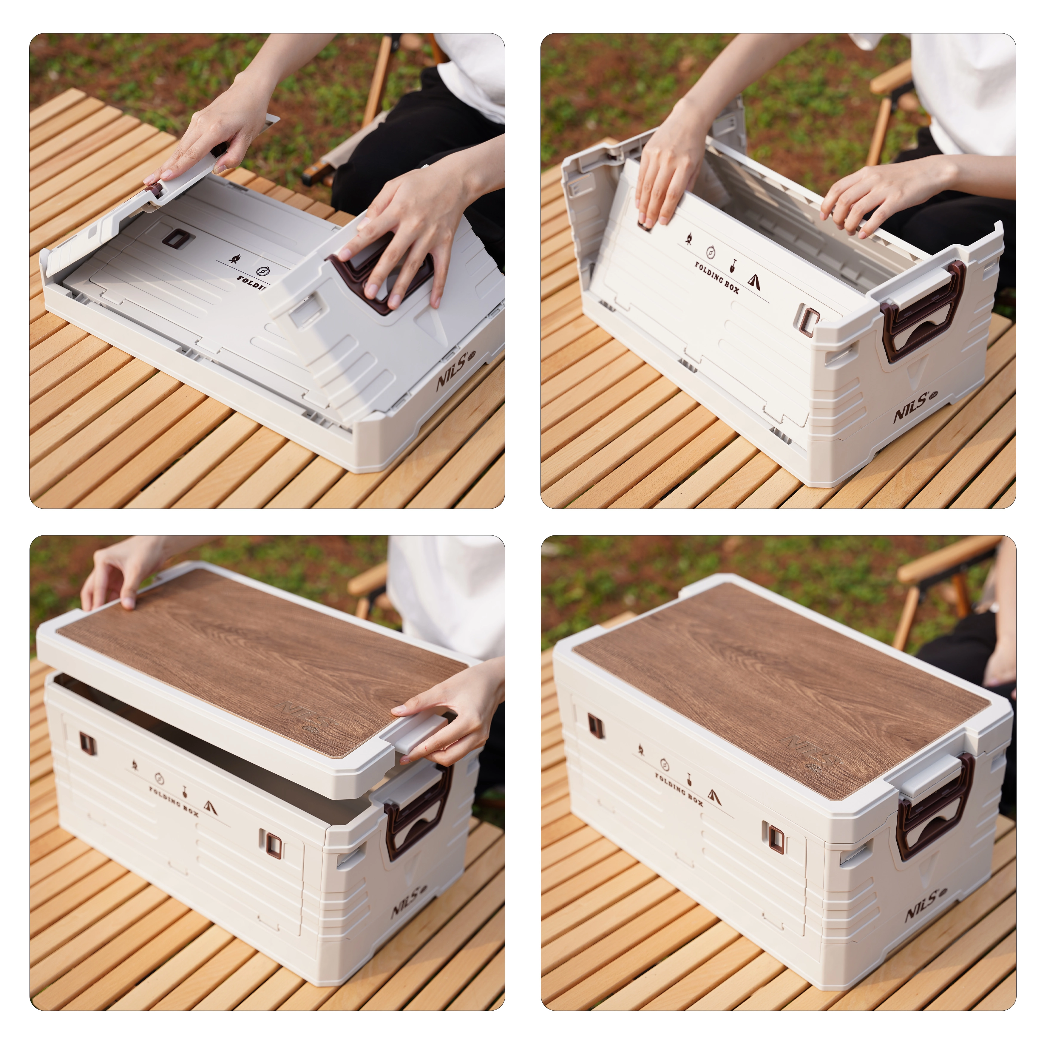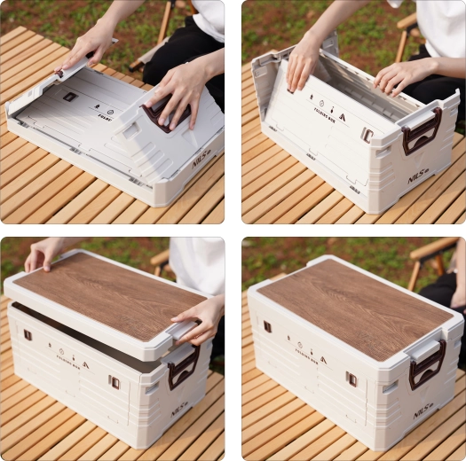 Het afneembare houten blad verandert de box in een handomdraai in een stabiel tafeltje of werkoppervlak – ideaal voor kamperen, de tuin en de werkplaats.