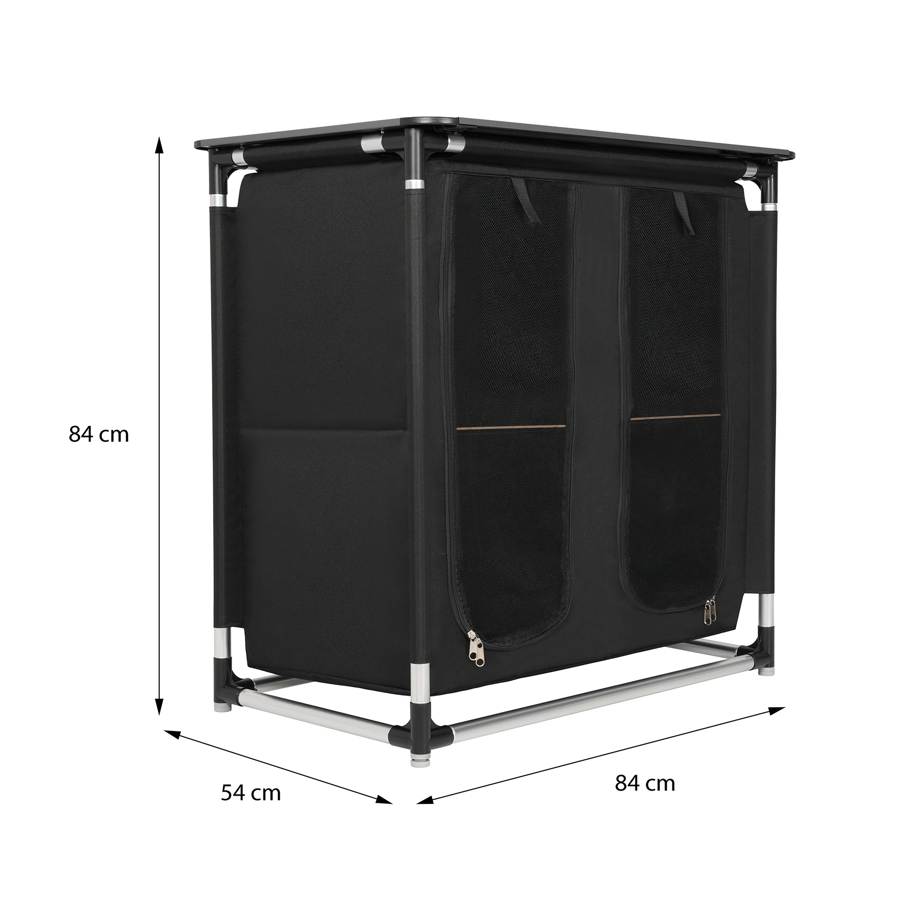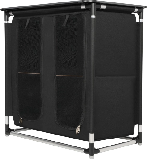De binnenruimte bestaat uit 4 afzonderlijke compartimenten met planken van gelamineerd multiplex, ideaal voor voedsel, servies, kleding of outdooruitrusting. Voorpanelen met rits beschermen de inhoud tegen stof, wind en insecten. Het bovenblad met 9 aluminium lamellen van 83 × 52 cm dient als stabiel werk- of aflegvlak.