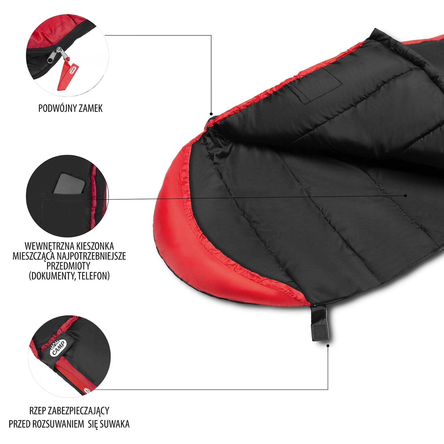 De tweerichtingsrits is afgedekt met een isolerende tochtstrook en wordt gezekerd met een brede flap met klittenband, zodat hij ’s nachts niet onbedoeld opengaat. De capuchon met trekkoord en koordstopper beperkt het warmteverlies verder. Inclusief een praktische compressiehoes die, eenmaal aangesnoerd, het volume met ongeveer een derde vermindert.