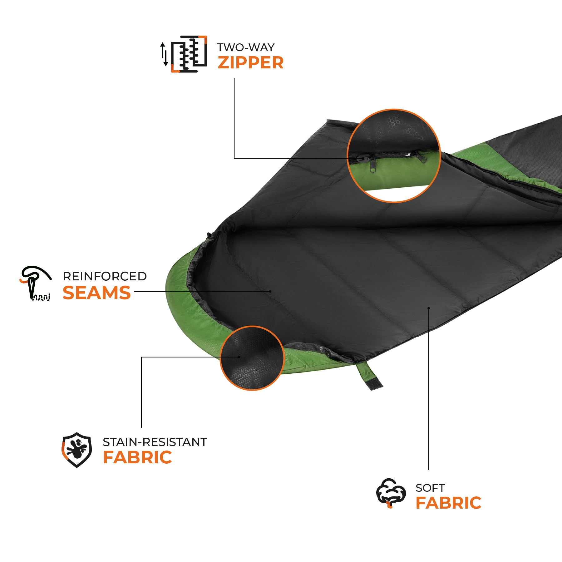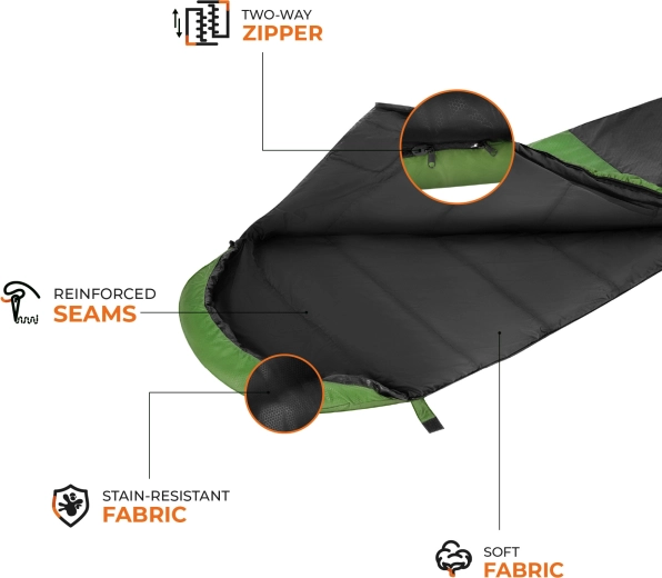 De dubbele polyester vulling houdt de warmte effectief vast en blijft ademend. Perfect voor lente- en zomernachten met reserve tot 0 °C in noodgevallen.