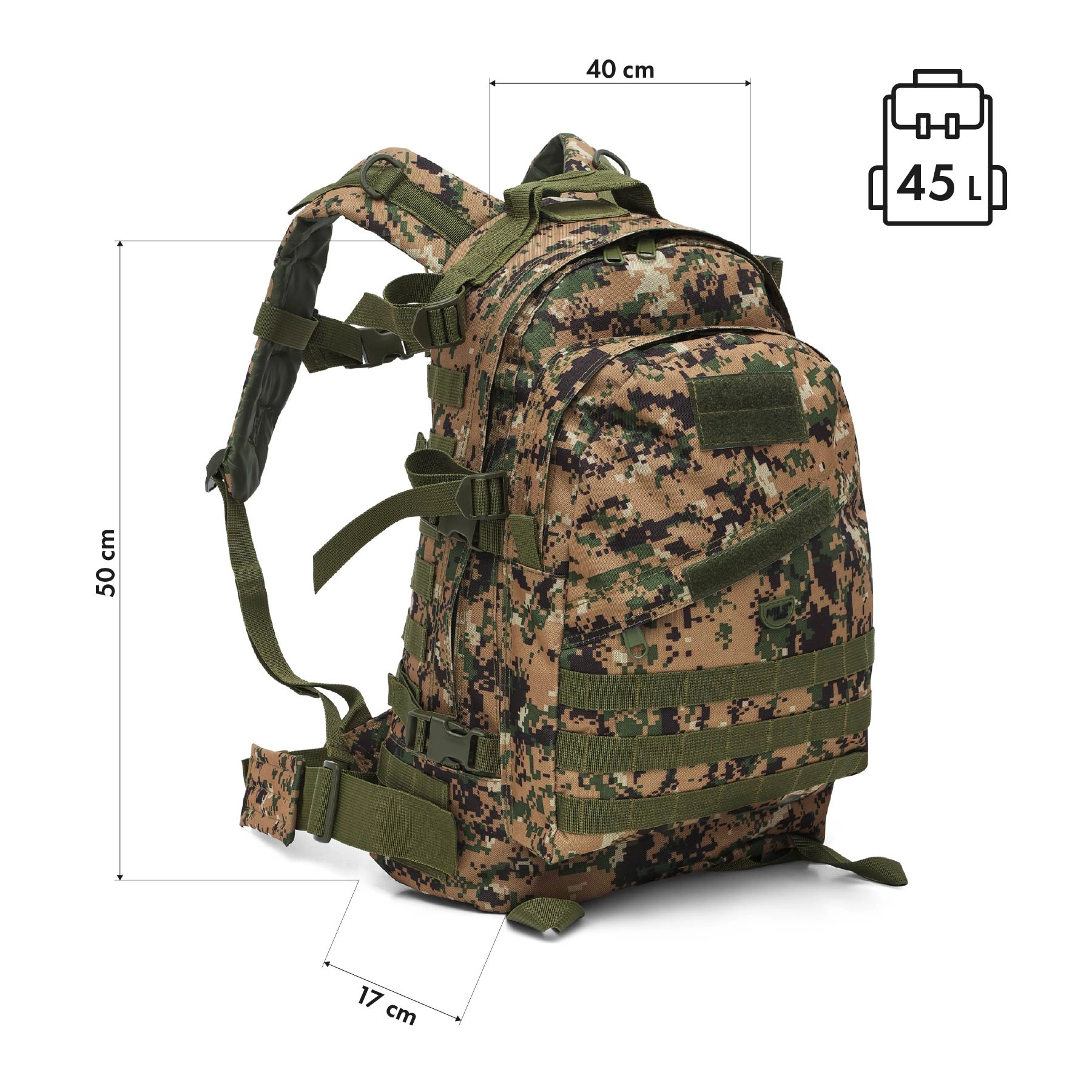 Deze camouflage rugzak combineert functionaliteit, laag gewicht en een tactisch design. Het materiaal van duurzaam polyester met een PVC-coating en een interne 210D voering beschermt de inhoud tegen slijtage en vocht, terwijl het lage gewicht van slechts 1 kg zorgt voor comfortabel dagelijks gebruik.