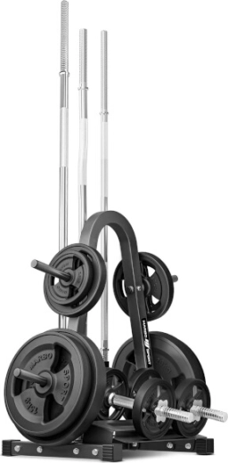 De standaard is uitgerust met 4 pennen voor schijven voor een efficiënte organisatie van gewichten, 3 verticale buizen voor halterstangen met een diameter van 28–30 mm en een praktische onderste plank voor 2 dumbbells. Dankzij de doordachte indeling bespaart hij ruimte en verhoogt hij de veiligheid tijdens de training.