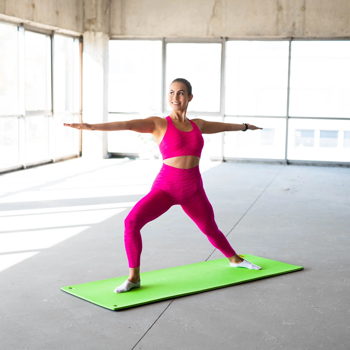Het getextureerde oppervlak zorgt voor een zekere grip bij statische houdingen en dynamische trainingen – ideaal voor yoga, pilates, stretchen en krachttraining.