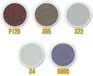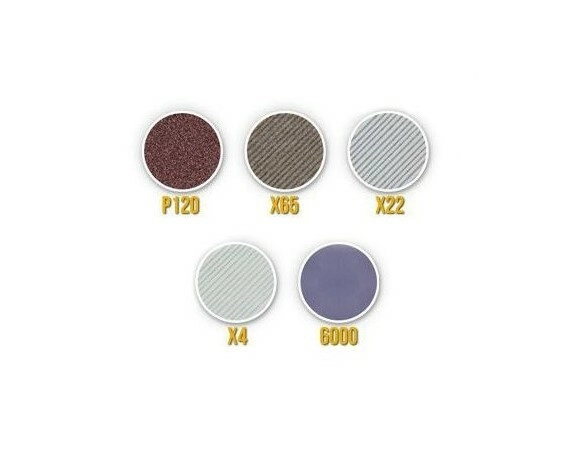• Brede dekking van korrelgroottes: P120 voor snel corrigeren van de snede, X65 en X22 voor vormen, X4 voor voorpolijsten, P6000 voor de eindpolijst.