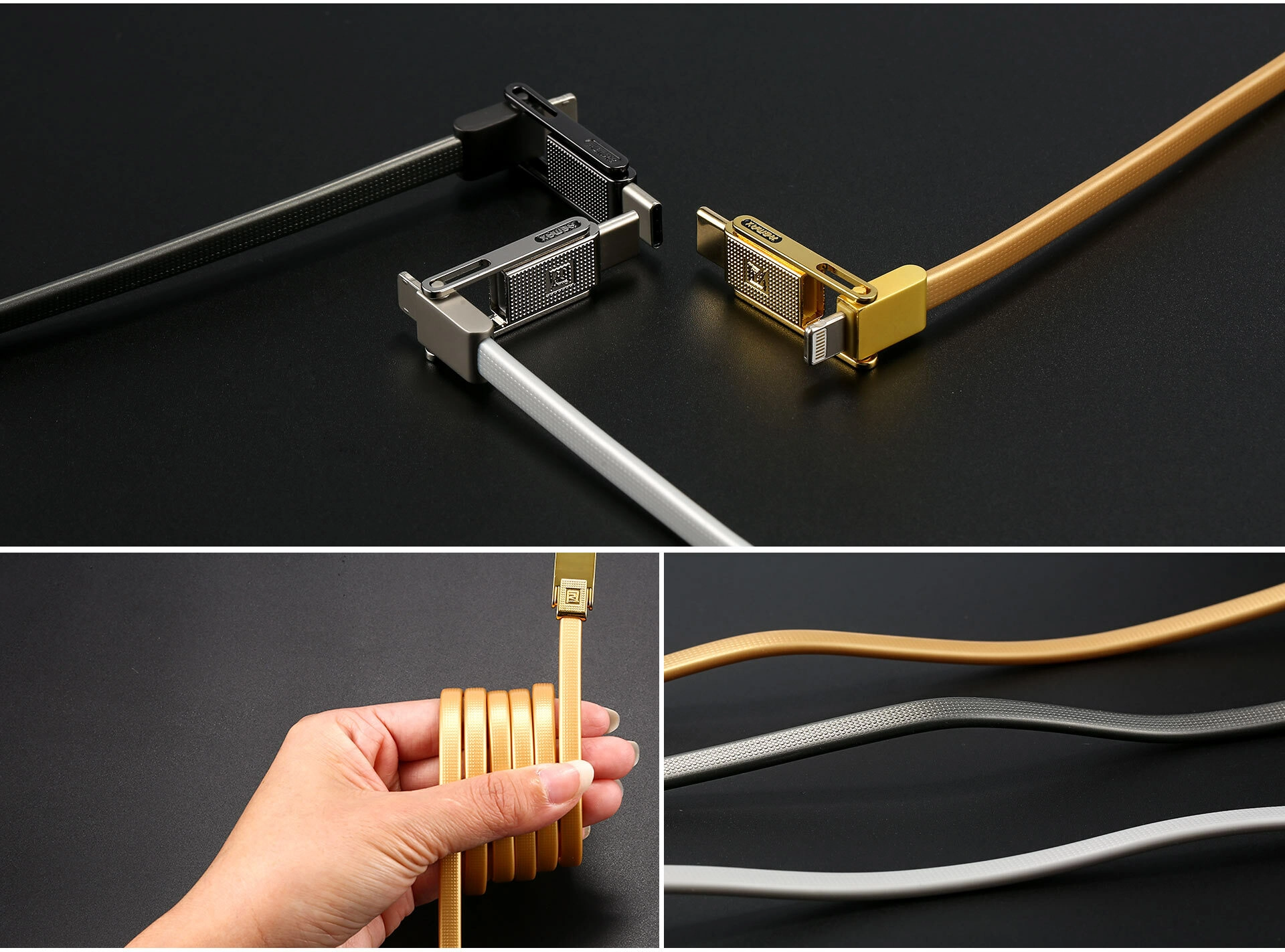 Platte, niet‑in-de-war rakende kabel met metalen uiteinden in een elegante gouden kleur, bestand tegen dagelijks gebruik.