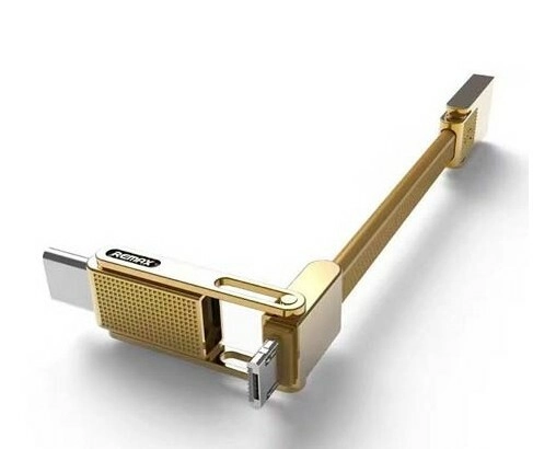 De universele 3‑in‑1 REMAX‑kabel in een elegante gouden kleur combineert USB‑C-, Micro‑USB- en Lightning-connectoren voor handig opladen en gegevensoverdracht tussen apparaten. Biedt snelle synchronisatie tot 480 Mb/s, een stroomsterkte van 2,1 A en een duurzaam ontwerp van TPE en koper voor een lange levensduur.