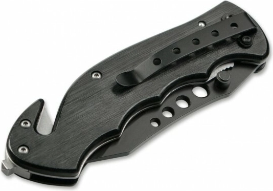 Veiligheid en functionaliteit worden gegarandeerd door de Linerlock-vergrendeling en het robuuste handvat van zwart geanodiseerd aluminium met het embleem van de eenheid. De geïntegreerde glasbreker en gordelsnijder komen van pas in noodgevallen, terwijl de zakclip zorgt voor comfortabel dragen en directe beschikbaarheid.