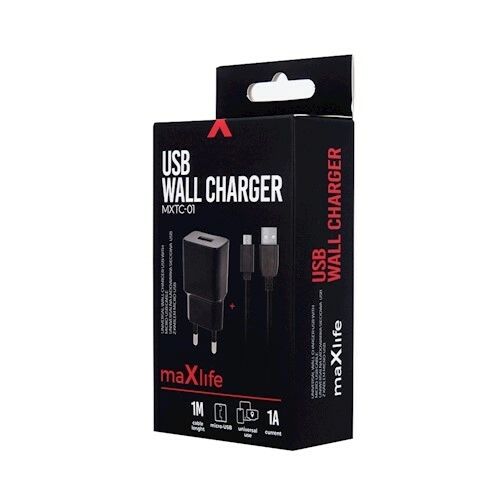 De praktische Maxlife-netlader is een uitstekende oplossing voor dagelijks opladen van apparaten met een Micro USB-connector. Het eenvoudige ontwerp in het zwart past in elk huishouden en kantoor en levert een stabiel vermogen van 1 A voor zorgvuldig opladen van oudere smartphones, Bluetooth-luidsprekers, hoofdtelefoons en andere kleine elektronische apparaten.