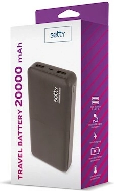 Compacte en betrouwbare SETTY powerbank 20.000 mAh in elegante zwarte uitvoering zorgt voor voldoende energie onderweg. Laad smartphones, tablets en andere apparaten altijd en overal op dankzij twee USB-uitgangen en een handige micro-USB-ingang. De stabiele 5V-uitgang met een stroom tot 2,4 A zorgt voor snel en veilig opladen.