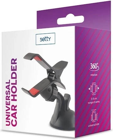 In de verpakking vind je een telefoonhouder in een elegante zwarte uitvoering. Het product wordt vervaardigd door TelForceOne onder het merk SETTY, bekend om praktische accessoires voor mobiele apparaten.