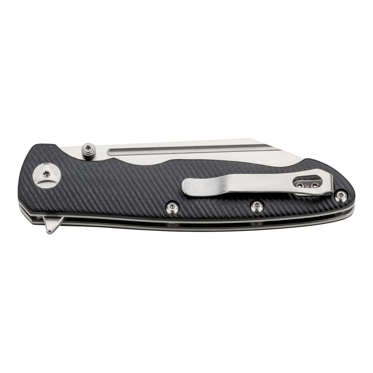 De ergonomisch gevormde en getextureerde handgreep van zwart G10 met stalen liners ligt zeker in de hand en de vingeruitsparingen vergroten de controle tijdens het snijden. De Linerlock vergrendelt het lemmet betrouwbaar in geopende positie en de broekclip maakt dagelijks dragen discreet en comfortabel.