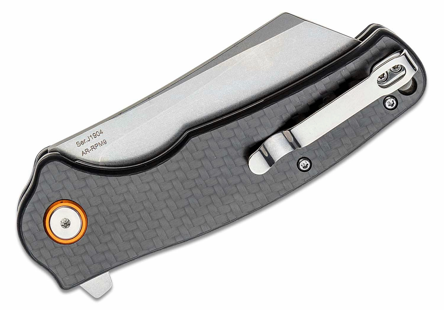 Robust en betrouwbaar zakmes CJRB Crag met een cleaver-lemmet van poedermetallurgische staalsoort AR‑RPM9 en stonewash-afwerking, geschikt voor veeleisende taken. Dankzij de compacte afmetingen ideaal voor dagelijks (EDC) dragen, zowel buiten als thuis. De flipper zorgt voor snel openen en de liner lock voor veilig gebruik, terwijl het handvat van koolstofvezel in grijs een stevige en comfortabele grip biedt.