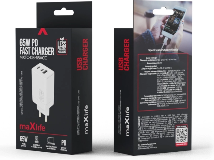 Zoek je een compacte en krachtige oplader voor al je apparaten? De Maxlife 65W biedt topklasse snel opladen met ondersteuning voor PD en QC, waardoor hij overweg kan met moderne smartphones, tablets en geselecteerde laptops met USB‑C. Drie uitgangen (2× USB‑C, 1× USB‑A) zorgen voor comfortabel en veilig voeden van meerdere apparaten tegelijk.