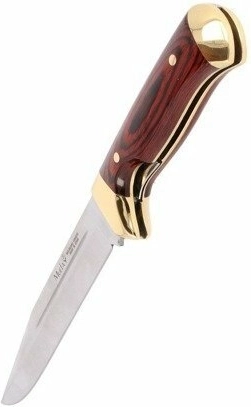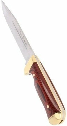 Het lemmet van molybdeen-vanadium (MoVa) staal met satijnen afwerking behoudt de scherpte en weerstaat corrosie. De Liner Lock fixeert het lemmet betrouwbaar tijdens gebruik. De ergonomische handgreep van gelaagd Pakkahout, aangevuld met een messing stootplaat en pommel, zorgt voor een comfortabele en zekere grip, ook bij langdurig gebruik. Inclusief een bruin leren foedraal voor veilig en stijlvol dragen.