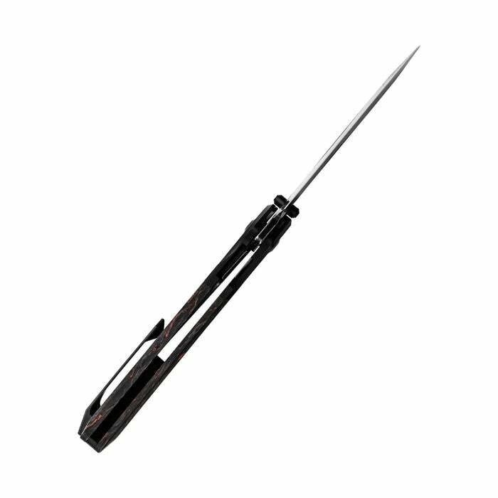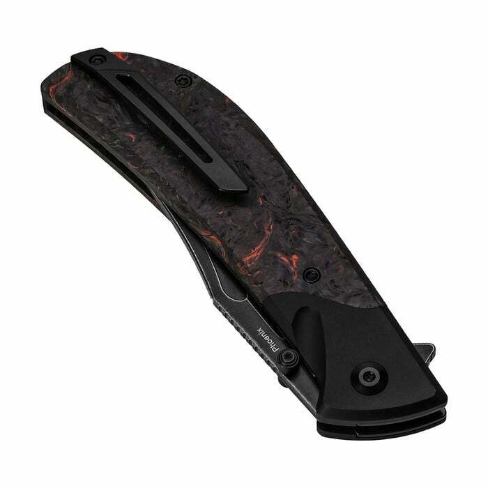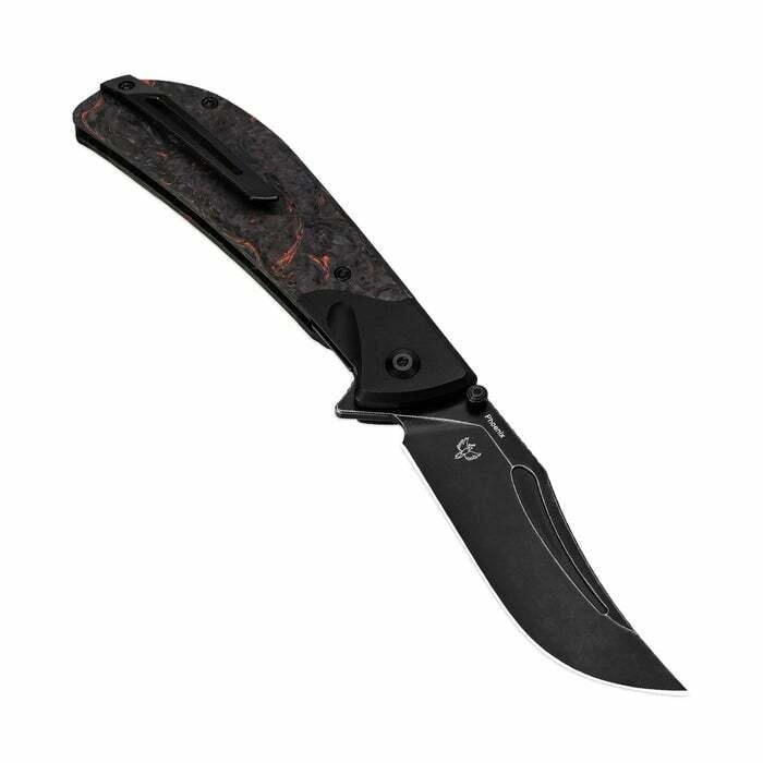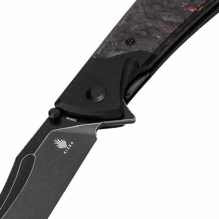 Elegante EDC-vouwmes Kizer Phoenix met premium staal CPM-S35VN, Black Stonewash-afwerking en een lichte, duurzame handgreep van FAT Carbon en aluminium. Biedt snel eenhands openen via flipper en duimstud, een betrouwbare liner lock vergrendeling en een broekklem voor makkelijk dragen.