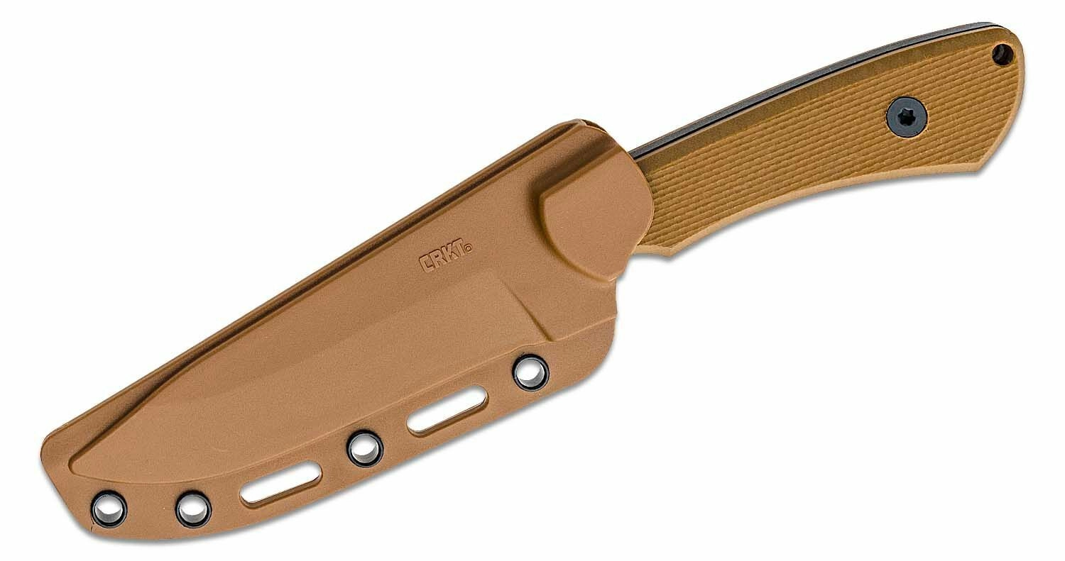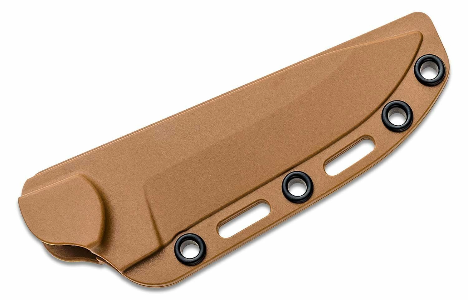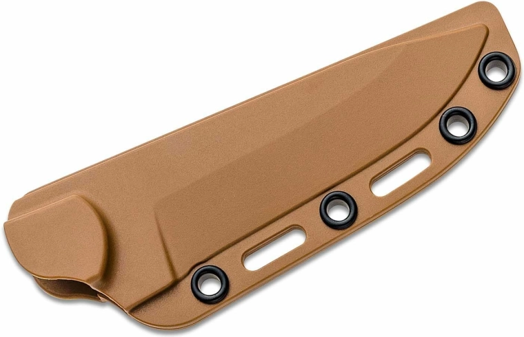 Het ergonomisch gevormde handvat van G10 in coyote brown heeft een agressieve textuur voor zekerheid in de hand, ook met handschoenen en in natte omstandigheden. Doordachte ribbels (jimping) op de rug van het lemmet verhogen de controle bij precies snijden. Het mes wordt geleverd met een lichte maar zeer duurzame kunststof schede met meerdere openingen voor variabele bevestiging – aan de riem, MOLLE of verborgen dragen.