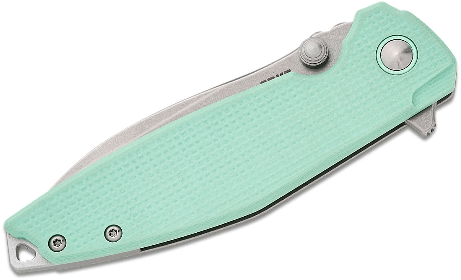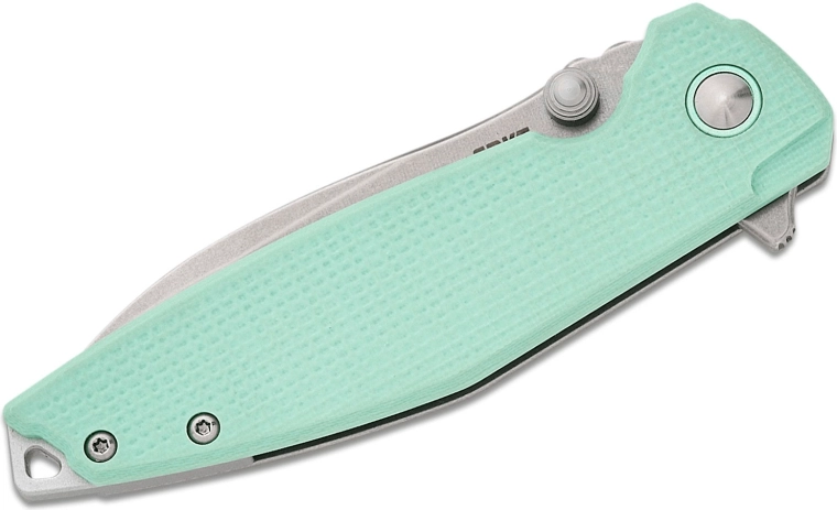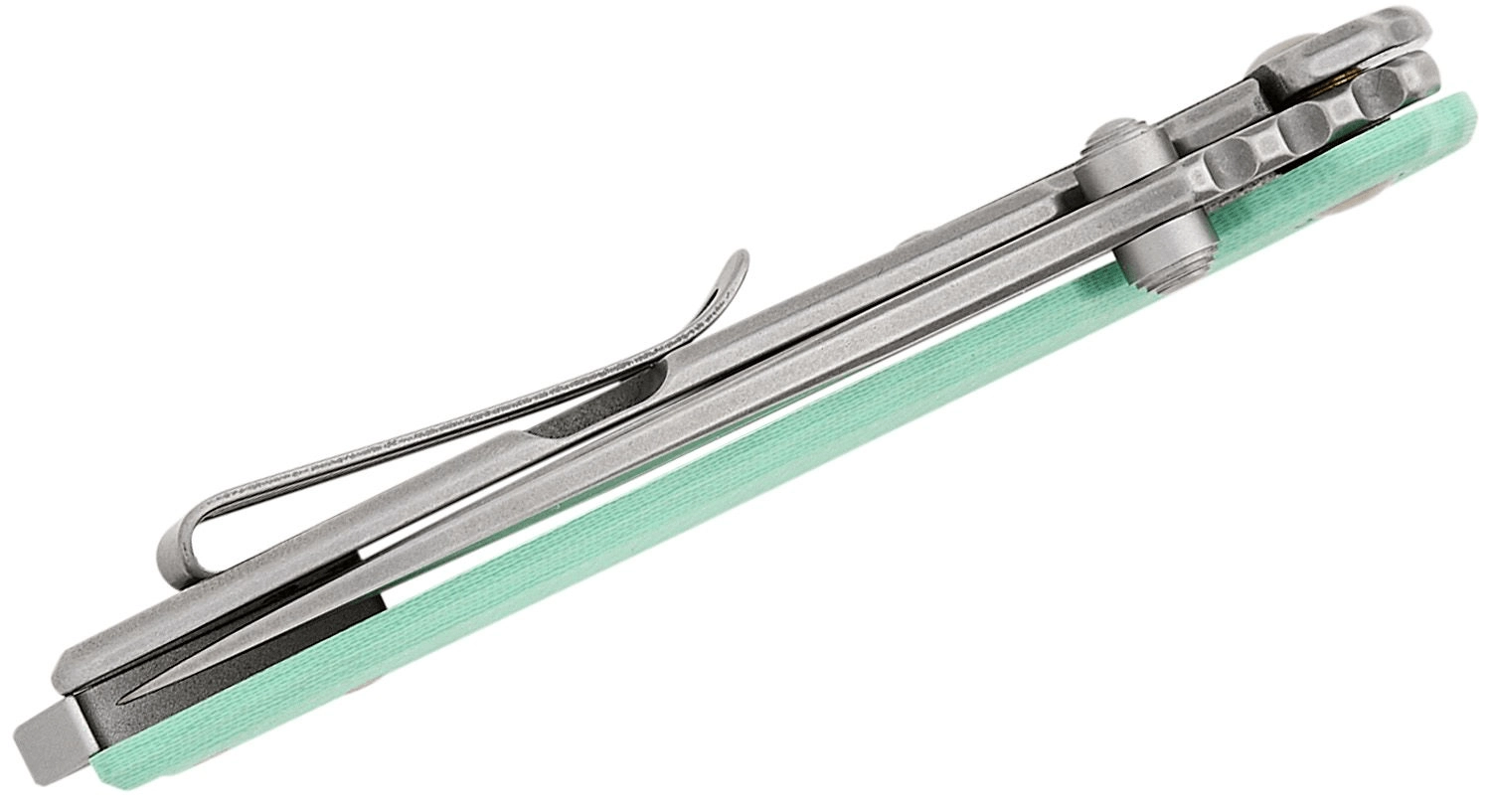 Het handvat van G10 in blauwgroen biedt een zekere grip, terwijl de stalen rugzijde met frame lock zorgt voor een veilige vergrendeling van het lemmet. De praktische broekclip en het koordoog maken dragen en snelle toegang eenvoudig.