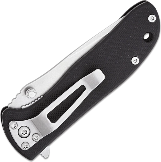 Snelle en intuïtieve opening dankzij zowel de flipper als de dubbelzijdige duimpin – kies wat jij het prettigst vindt. De robuuste linerlock vergrendelt het lemmet stevig in werkpositie. De ergonomische greepschalen van zwart G10 met antisliptextuur liggen uitstekend in de hand en de praktische broekclip en het gat voor paracord ontbreken niet.