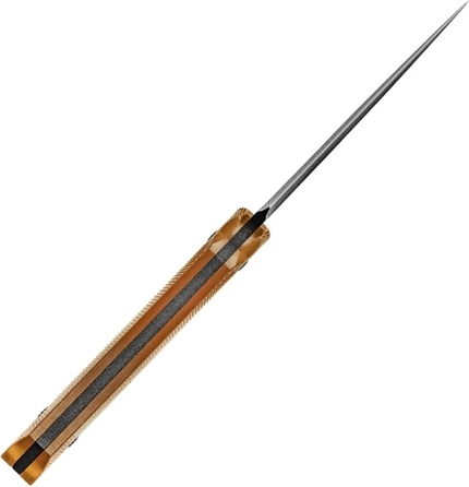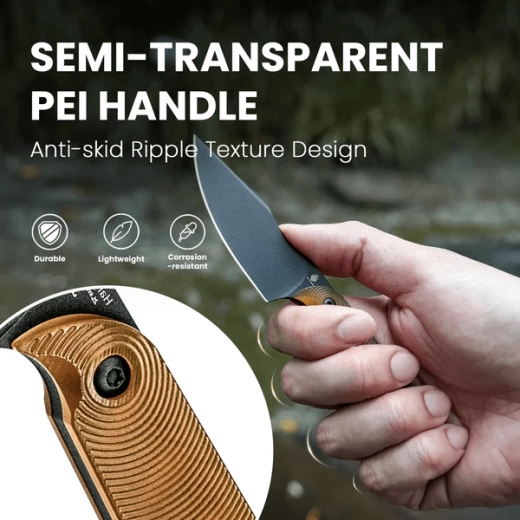 Het handvat van Ultem PEI is niet alleen duurzaam en licht, maar ook halftransparant, waardoor de interne liners met een elegant “capsule”-patroon zichtbaar zijn. De vormgeving van het handvat en de antisliptextuur zorgen voor een zekere grip, ook in natte omstandigheden. In de set zit een Kydex schede met carbonvezel-design voor veilig en comfortabel dragen aan riem of uitrusting.