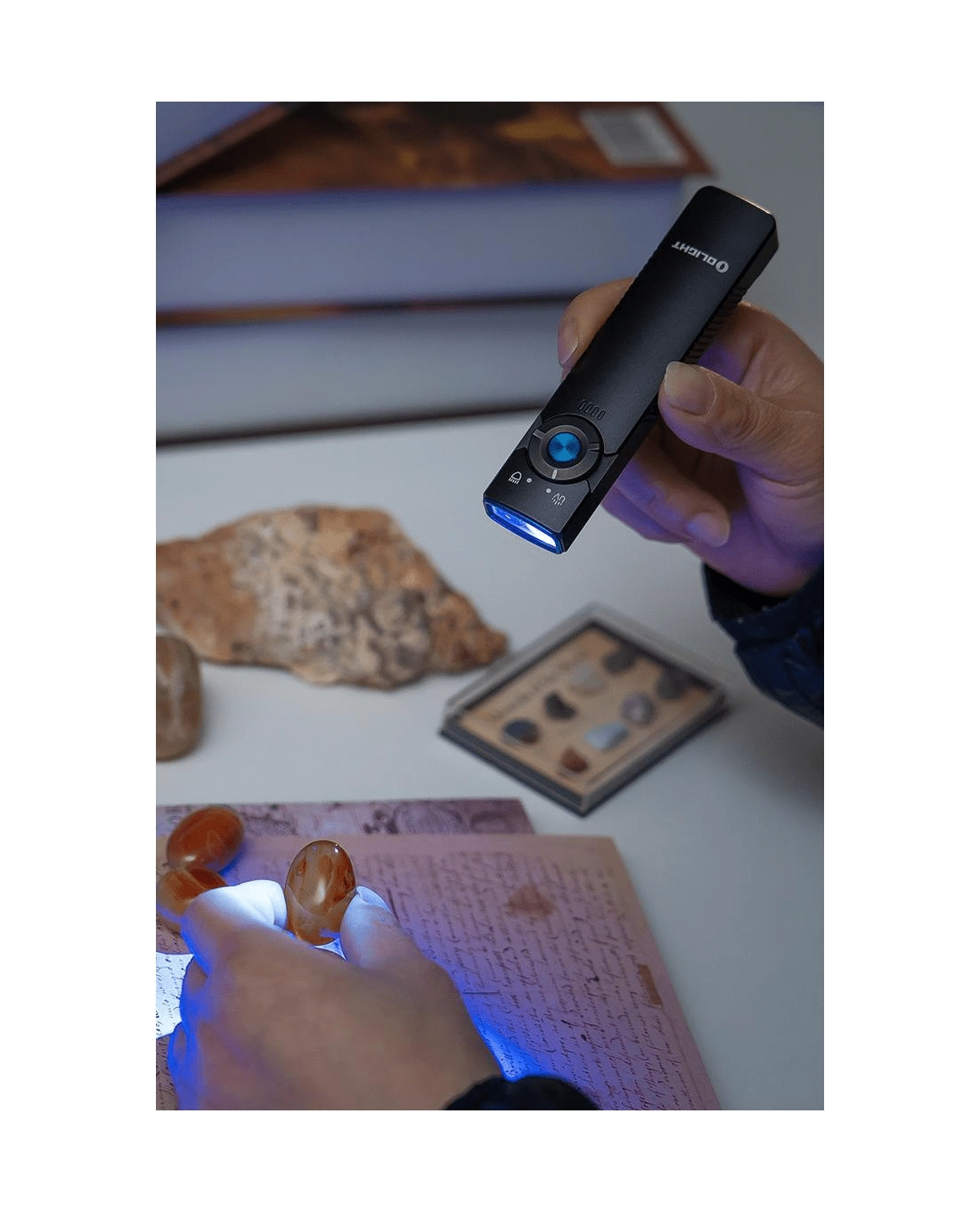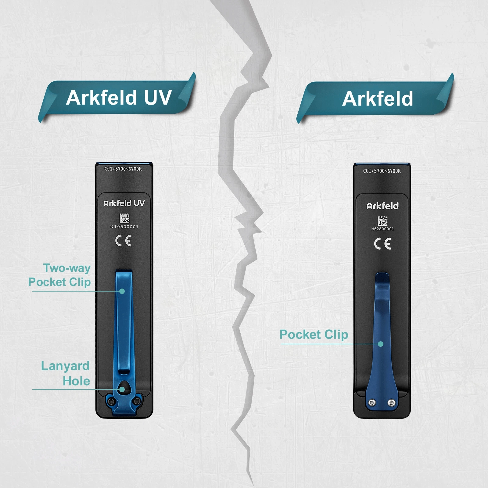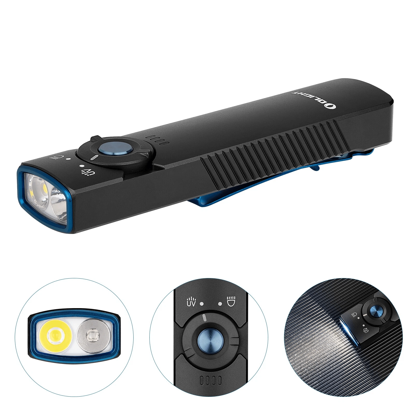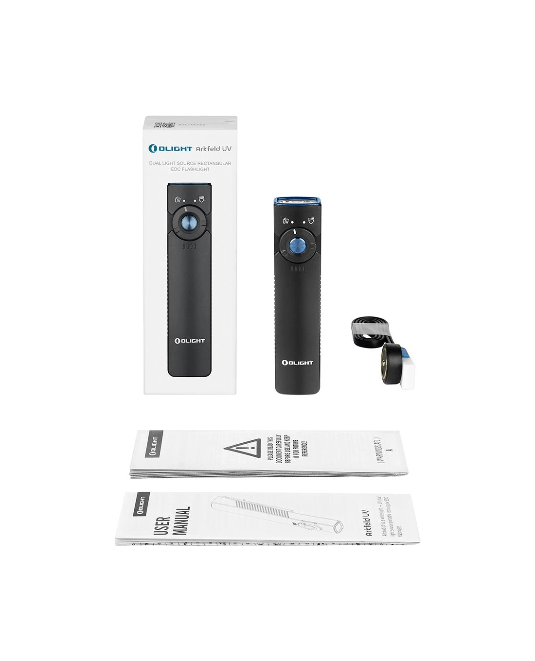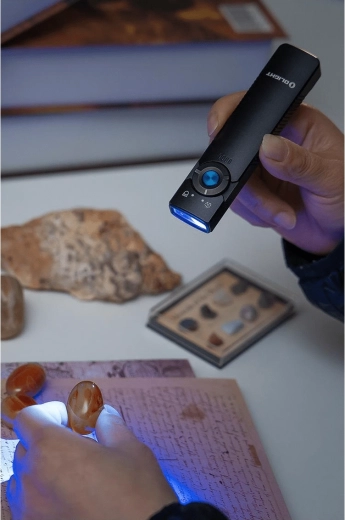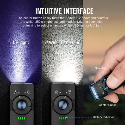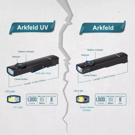 De OLIGHT Arkfeld UV is een EDC-zaklamp voor in de broekzak met een uniek plat ontwerp, die neutraal witte LED (4000–5000 K) voor dagelijks licht combineert met een UV-diode 365 nm (580 mW) voor controle van bankbiljetten, detectie van fluorescerende mineralen of hygiëne van oppervlakken. Het maximale bereik van het witte licht is 85 m en de piekoutput bedraagt 1.000 lm.