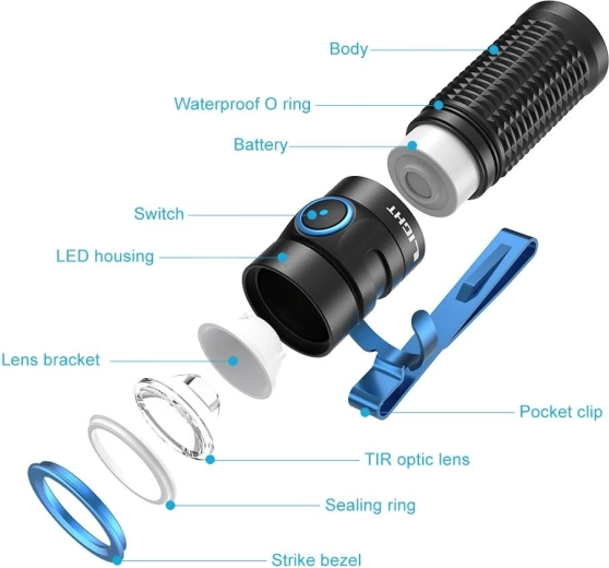 - 5 lichtniveaus + stroboscoop voor tactische en EDC-toepassingen