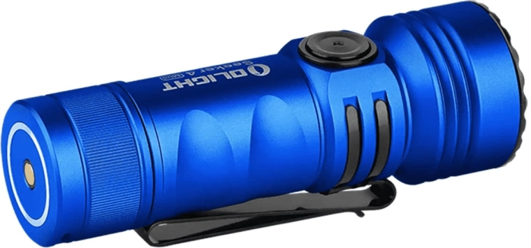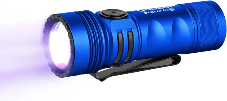 De compacte zaklamp OLIGHT Seeker 4 Mini in het blauw combineert wit licht en UV 365 nm (760 mW) voor dagelijks gebruik, hygiënecontrole, detectie van fluorescerende stoffen en outdoor. Biedt tot 1200 lm, tot 12 dagen gebruiksduur, magnetisch opladen en IPX8-waterdichtheid in een robuuste aluminium behuizing met tweewegclip en metalen zijdelingse schakelaar met statusindicator.