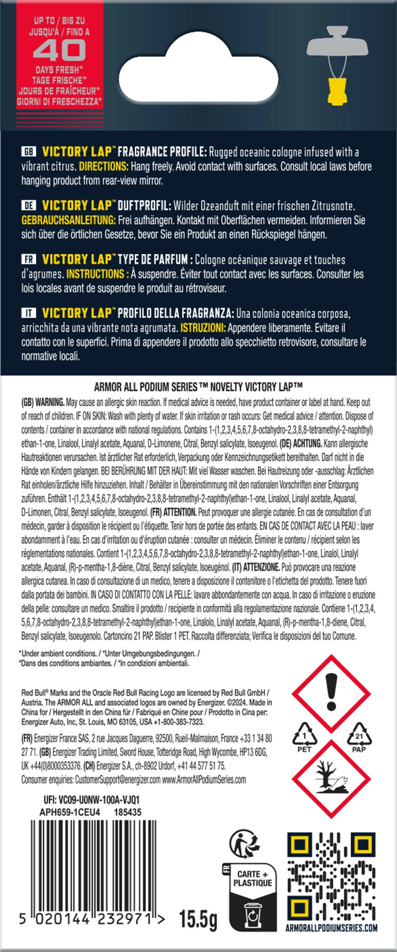 Verander de sfeer in je auto met één beweging. De hangkaart ARMOR ALL Oracle Red Bull Victory Lap geeft het interieur een energieke en frisse geur die oceaan-cologne combineert met citrusaccenten. Het design en aroma zijn ontwikkeld in samenwerking met het team van ORACLE RED BULL RACING, waardoor je naast functionaliteit ook sportieve stijl krijgt.