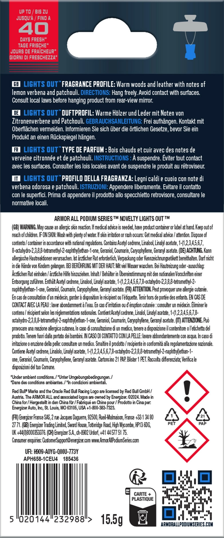 Een stijlvolle hangende autogeur in de vorm van een formule brengt in het interieur van uw auto een langdurige frisheid tot wel 40 dagen. De geur combineert warmte van hout- en leerakkoorden met een vleugje citroenverbena en patchoeli. Officiële samenwerking Armor All x ORACLE RED BULL RACING voor een heerlijk geurende cabine met motorsportkarakter.