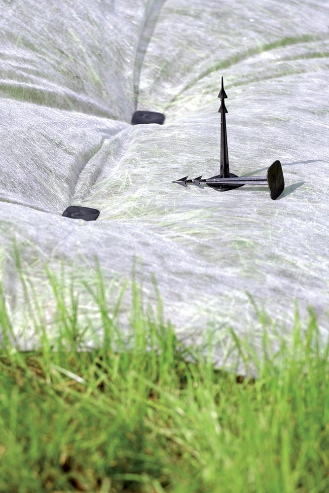 De platte, brede kop drukt agrotextiel of folie gelijkmatig tegen de ondergrond, waardoor opkrullen, opwaaien en verschuiven van het materiaal tot een minimum worden beperkt.