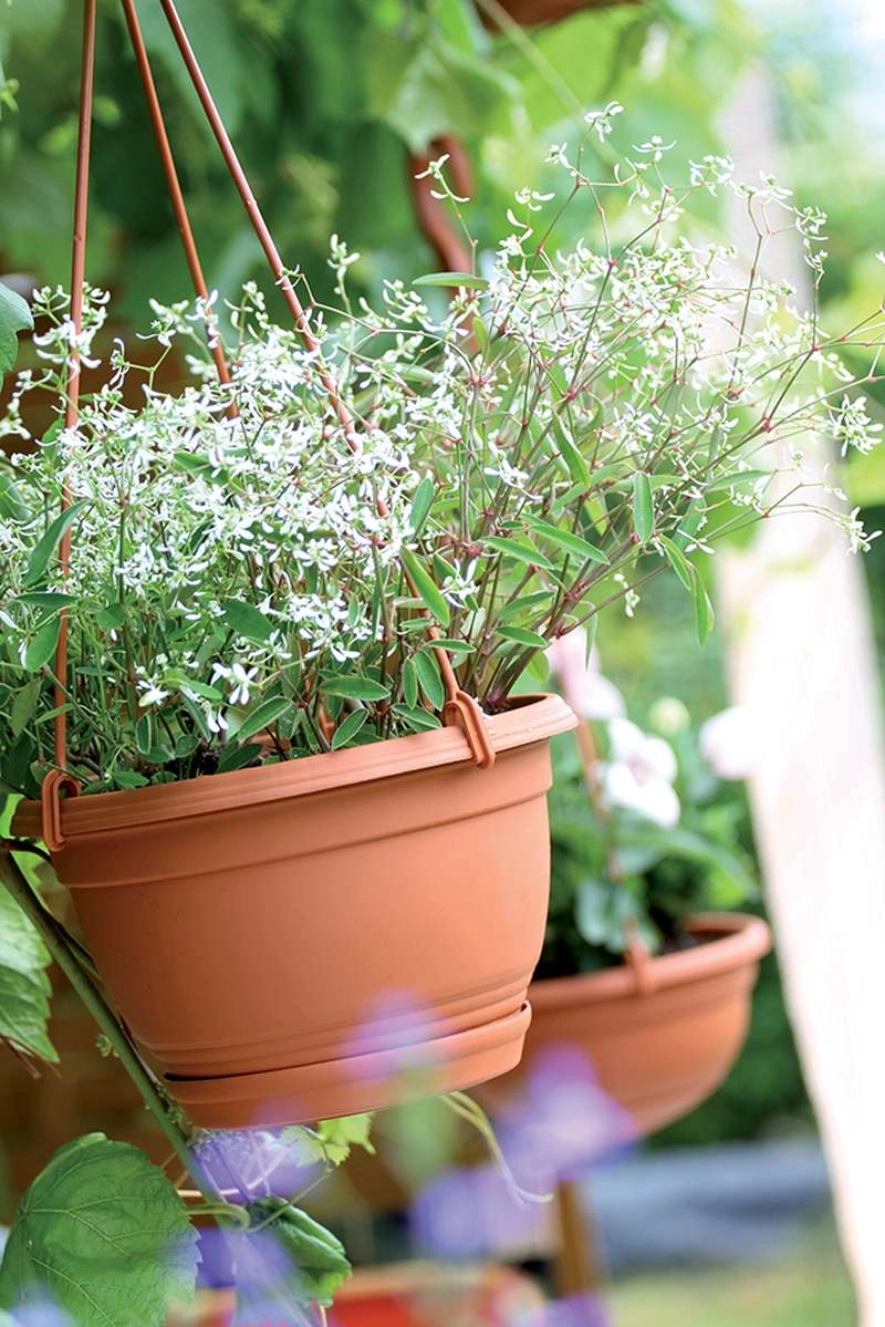 Elegante hangende bloempot in terracottakleur met een diameter van 27 cm, ideaal voor het kweken van favoriete bloemen zoals geraniums, fuchsia’s of petunia’s (surfinia’s). Biedt een duurzame kunststof met UV-bescherming, een praktische onderschotel tegen overbewatering en een afneembare haak voor eenvoudig ophangen. Na het verwijderen van de haak kan hij ook worden gebruikt als een klassieke staande bloempot voor balkon, terras of tuin.