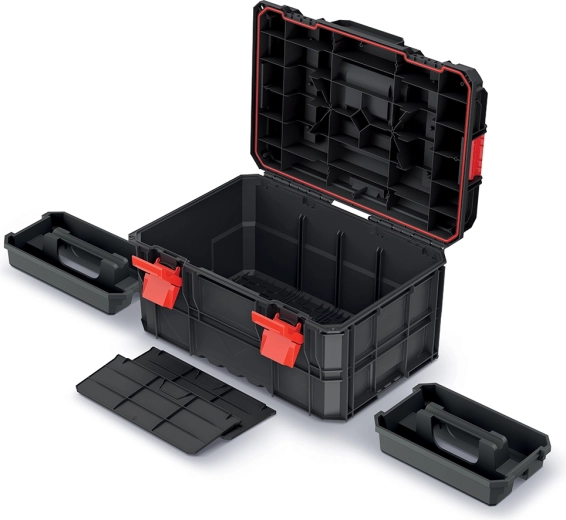Professionele gereedschapskoffer uit de X-Block Pro-lijn met een modulair systeem voor veilige koppeling van boxen, hoge duurzaamheid en afdichting tegen stof en water. Dankzij de robuuste geribbelde constructie, een draagvermogen tot 50 kg en directe belasting van modules tot 120 kg is hij ideaal voor dagelijks werk in veeleisende omstandigheden.